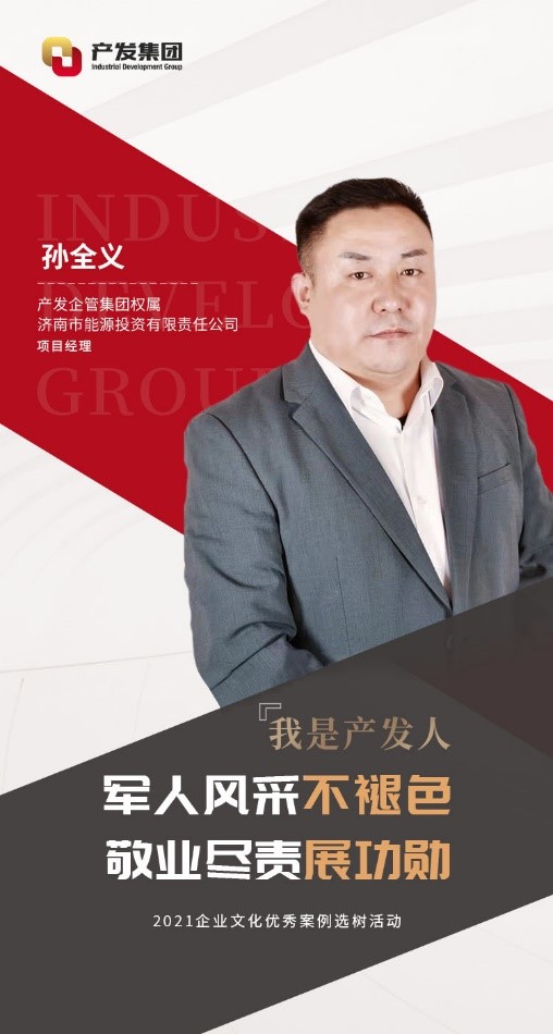 孫全義,現任產發企管集團權屬濟南市能源投資有限責任公司(以下簡稱“能投公司”)項目經理。2001年參軍,在部隊期間刻苦訓練,聽黨指揮,服從命令。2003年他從部隊光榮退役,隨后加入能投公司。期間曾借調至濟南市發改委幫助工作,現負責能投公司的資產管理工作。